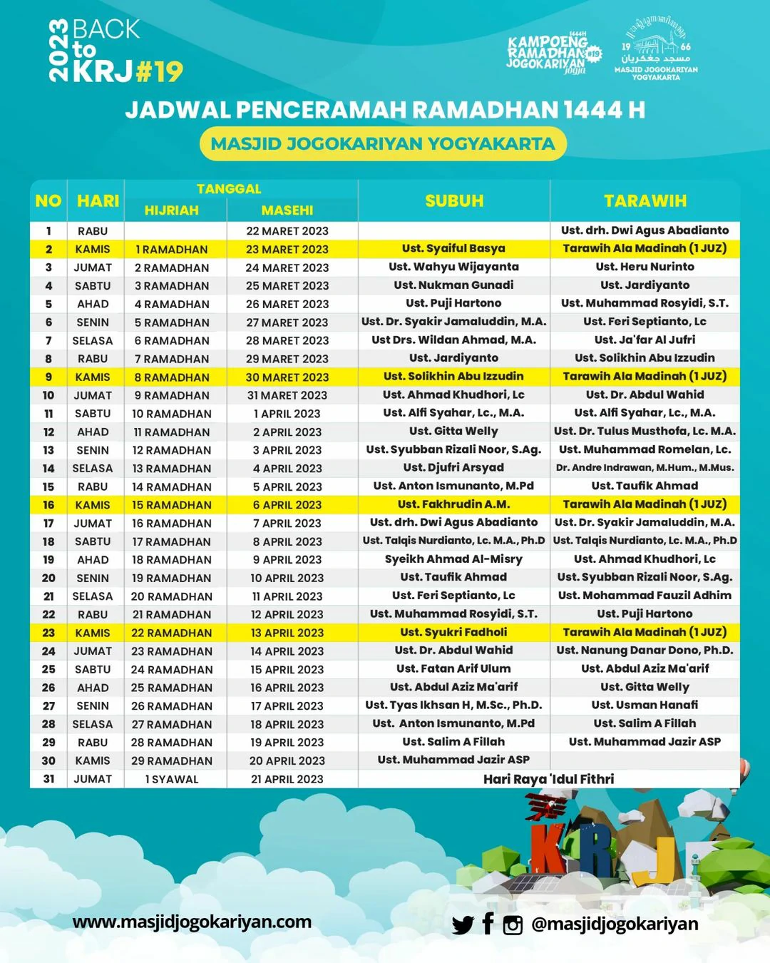 Berikut jadwal penceramah di Masjid Jogokariyan selama bulan Ramadan 1444 H (2023) untuk waktu salat tarawih.